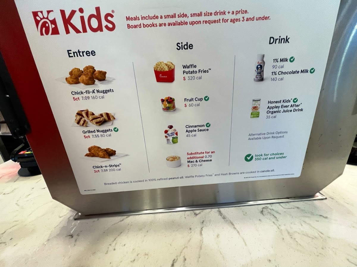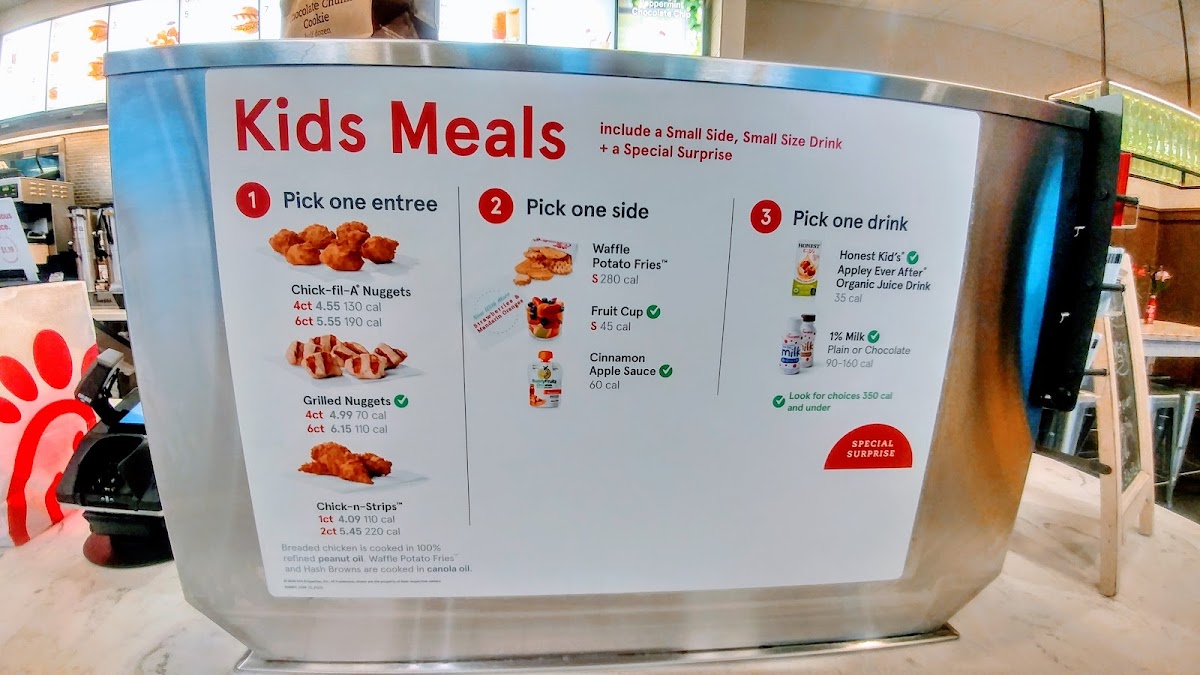 Includes a 1-count or 2-count of Chick-fil-A Chick-n-Strips®, a choice of a small Side Item (Cinnamon Apple Sauce, Mac & Cheese, Chick-fil-A Waffle Potato Fries®, or Fruit Cup), a kid’s size drink and a special surprise.